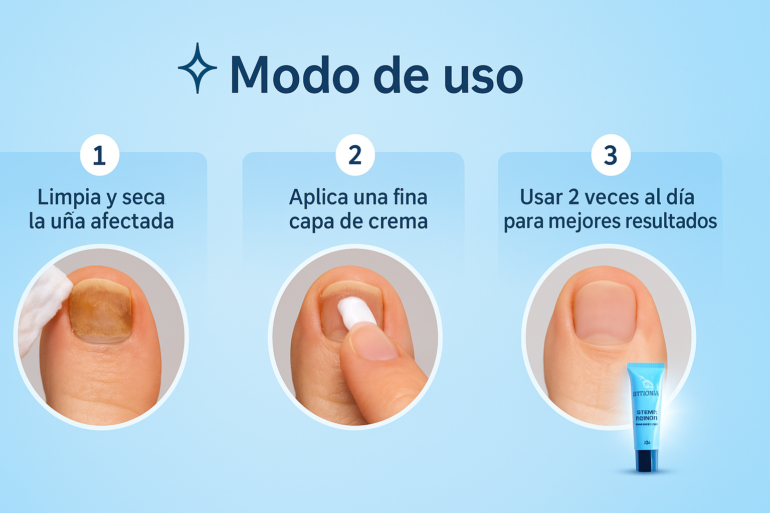 🕒 Aplicar 2 veces al día sobre la uña afectada, limpia y seca