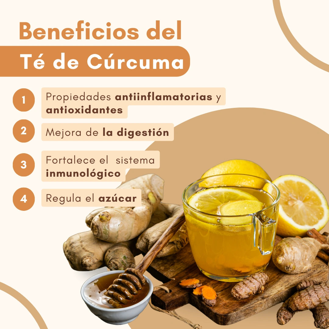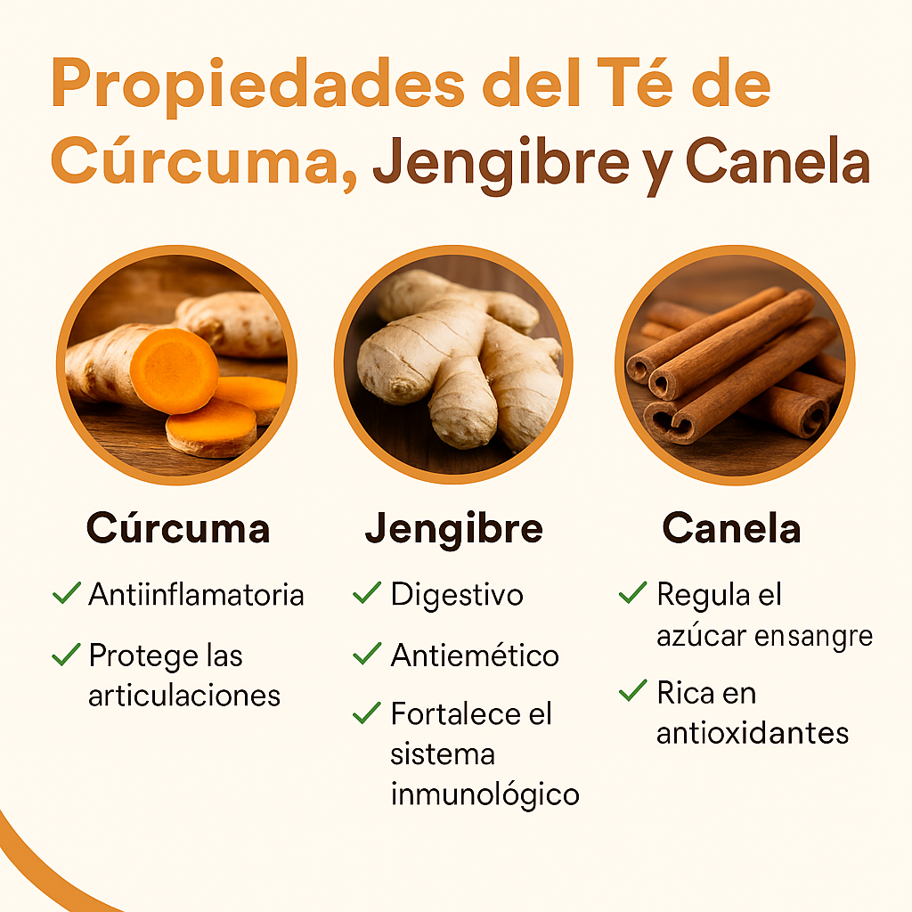 La combinación de cúrcuma, jengibre y canela potencia la circulación, combate la inflamación y mejora la digestión. Tomarlo diariamente ayuda a equilibrar tu cuerpo y llenarte de energía natural.